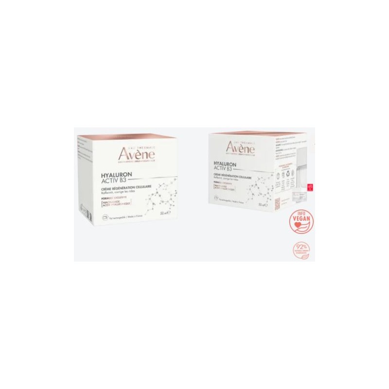 Con la edad todo se acelera. Las células envejecidas se extienden y la piel funciona a cámara lenta. Los laboratorios dermatológicos Avène han creado la crema Hyaluron Activ B3, concentrada al 0,2% en ácido hialurónico puro (de alto y bajo peso molecular) y niacinamida (6 %) para actuar sobre la causa del envejecimiento y prolongar la vida de las células*. La piel queda rellena, alisada y radiante desde la primera aplicación. Después de 2 semanas, se regenera, se reafirma y se reducen las arrugas**. Su textura aterciopelada y delicadamente perfumada proporciona comodidad a la piel. También es una muy buena prebase de maquillaje. La crema regeneradora celular Hyaluron Activ B3 es un producto de cuidado de la piel ecoconcebido que contiene un 92 % de ingredientes de origen natural y se presenta en un tarro de cristal 100 % recargable.