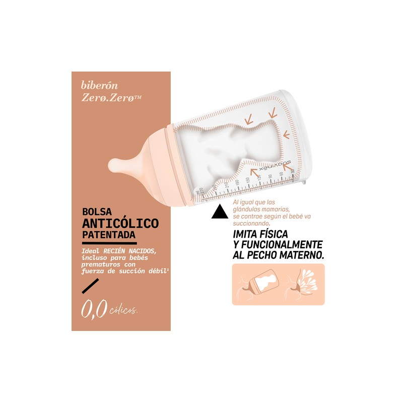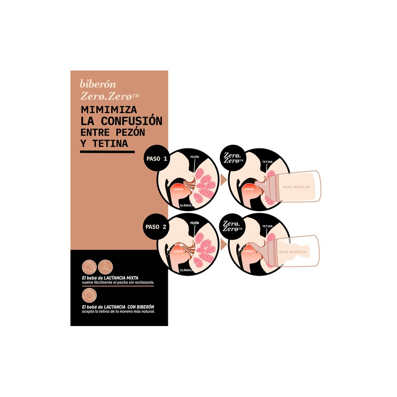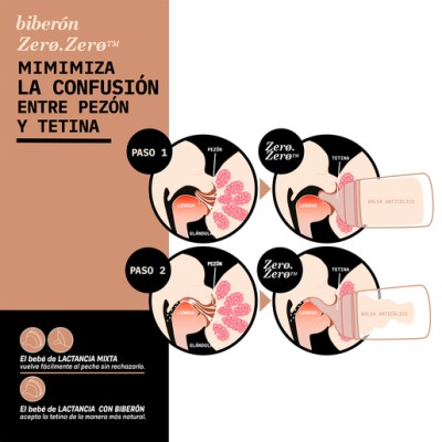 Con tetina de biberón Zero Zero basada en estudios científicos. Su diseño simula en forma, longitud y tacto el pezón materno, MINIMIZANDO así la CONFUSIÓN TETINA-PEZÓN.