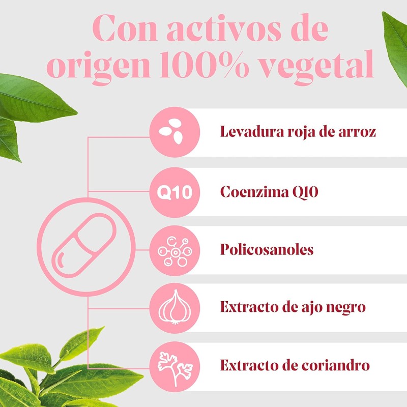 Complemento alimenticio 100% vegetal a base de Policosanoles, Coenzima Q10, Levadura roja de arroz y extractos de Ajo negro y Coriandro.