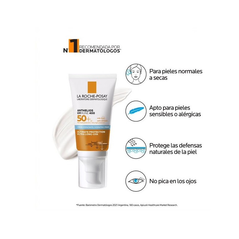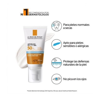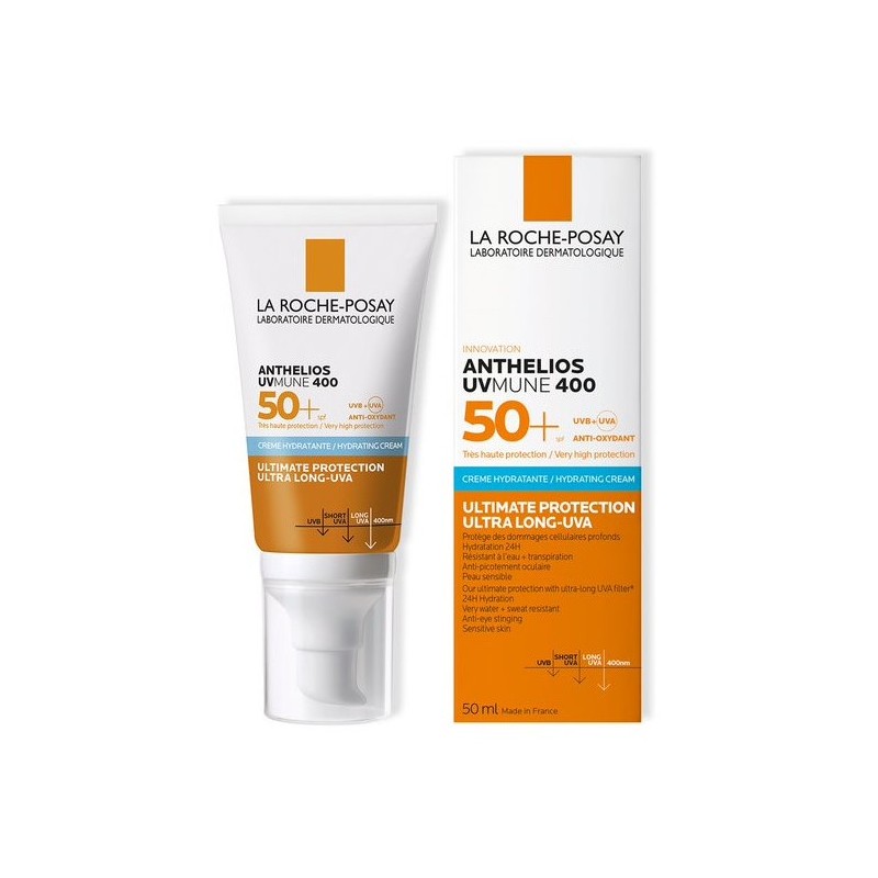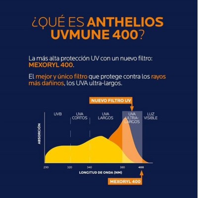 Anthelios UV MUNE 400 Crema Hidratante FPS 50+ es un protector solar que ofrece la más alta protección de rayos UVB, UVA e incluso UVA ultra-largos* (los más dañinos del espectro solar), gracias a su nuevo e innovador filtro: Mexoryl 400.