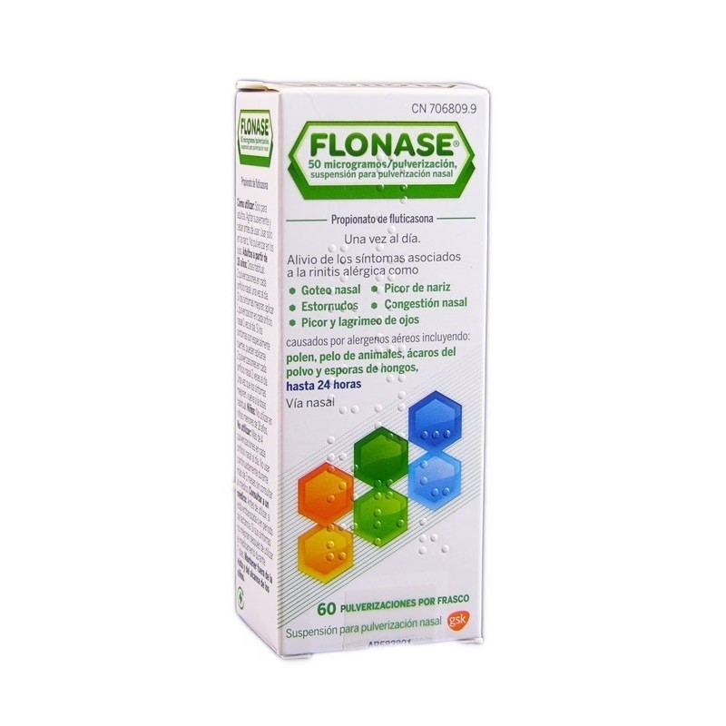 Flonase 50 mcg/Pulsacion Nebulizador Nasal 60 Dosis contiene fluticasona, un corticoide indicado para controlar la reacción del cuerpo ante los alérgenos. Alivia estornudos, goteo nasal, congestión y picor en la nariz.