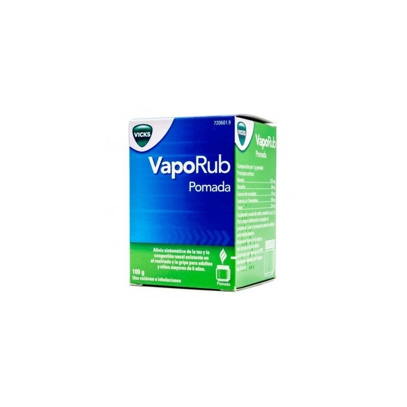 VapoRub es una pomada que se utiliza para el alivio sintomático de la tos y la congestión nasal existente en el resfriado y la gripe. Puede utilizarse directamente sobre la piel (uso cutáneo) o diluida en agua caliente para la inhalación de los vapores.