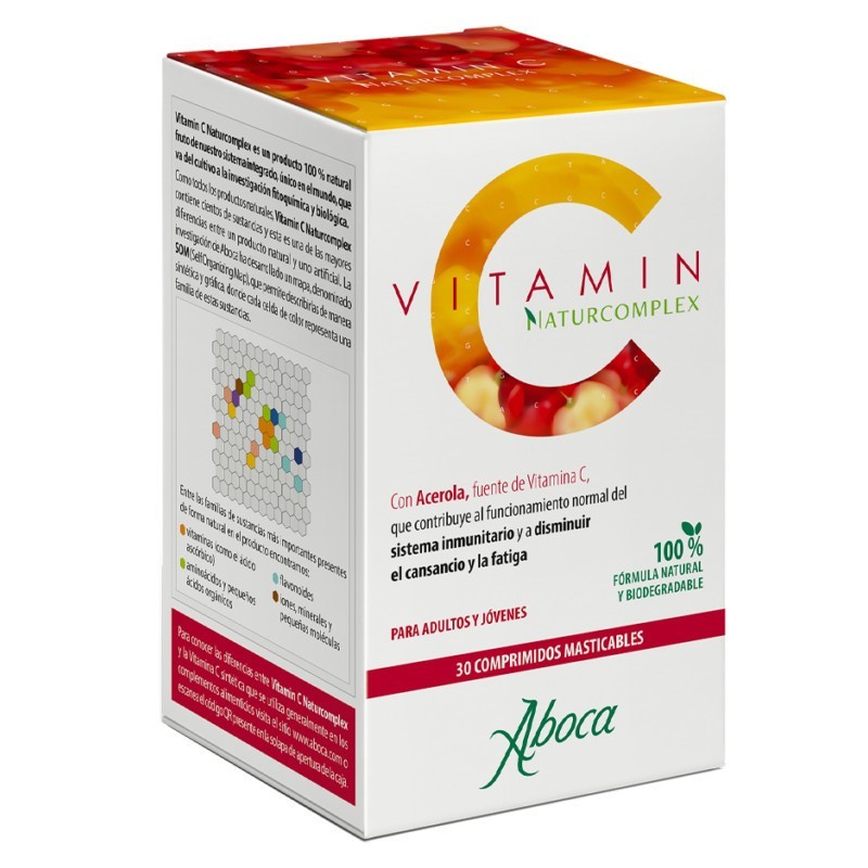Vitamin c naturcomplex de aboca es tu aliado perfecto para un extra de vitalidad. Se trata de un complemento alimenticio en cómodos comprimidos masticables, ideal para toda la familia. Su fórmula no es una vitamina c cualquiera, ya que se obtiene de fuentes naturales y muy potentes como la acerola y el camu camu. Además de aportarte la dosis necesaria de vitamina c, este complejo está enriquecido con los flavonoides que estas frutas contienen de forma natural, ¡potenciando aún más sus efectos beneficiosos! sistema inmune reforzado: ayuda a mantener tus defensas listas para la acción, especialmente en épocas de más riesgo (cambios de estación, invierno). Adiós al cansancio: contribuye a disminuir esa sensación de fatiga y agotamiento, dándote un empujón de energía. Bienestar nervioso: favorece el funcionamiento normal de tu sistema nervioso. Piel y huesos saludables: es fundamental para la formación normal de colágeno, una proteína vital para mantener la salud de tu piel, huesos, cartílagos y encías. Mejora la absorción del hierro: ayuda a tu cuerpo a absorber y aprovechar mejor el hierro de los alimentos o de otros suplementos.